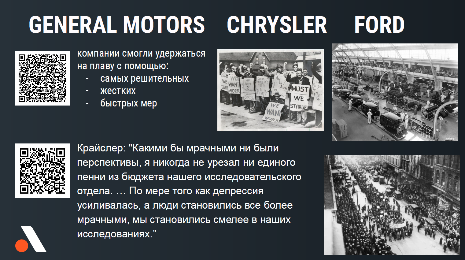 Тот же самый опыт Великой Депрессии говорит о том, что когда даже рынок упал так глубоко, рынок дешевых автомобилей вырос с 40 до 80%. И это также нужно принимать к сведению.